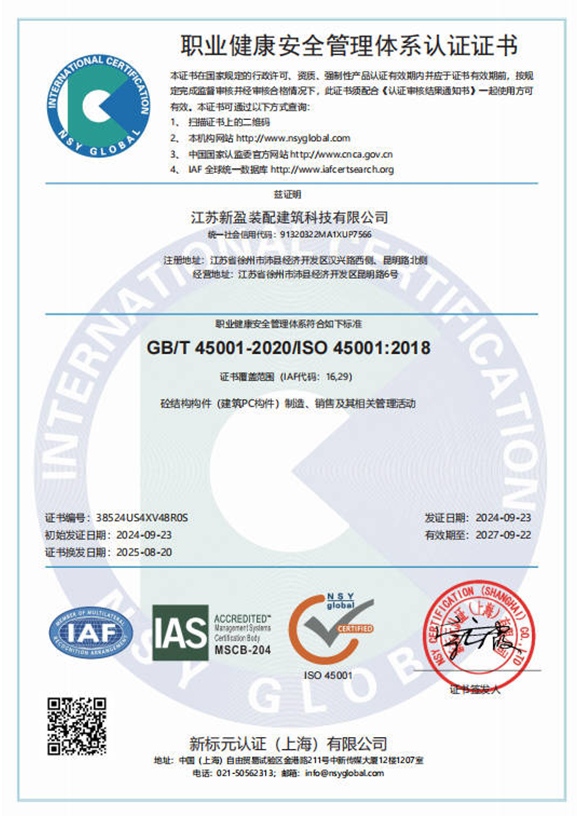 职业健康安全管理体系认证证书