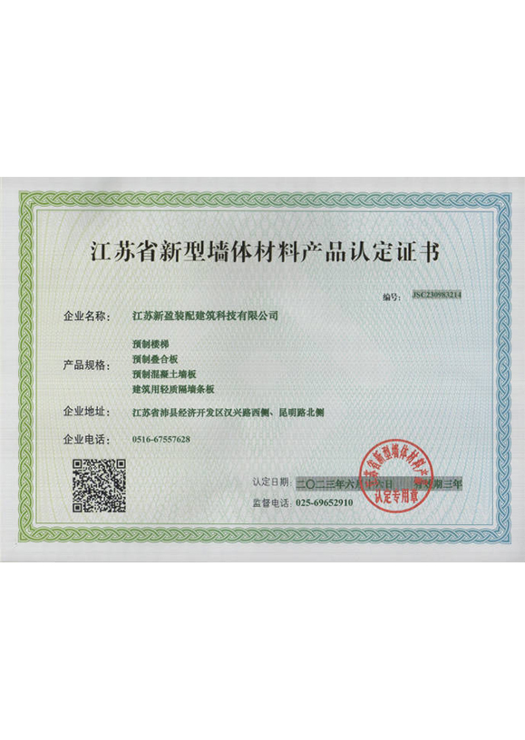 江苏省新型墙体材料产品认定证书