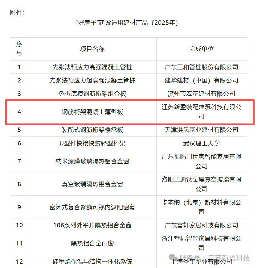 江苏新盈智能装备科技有限公司“钢筋桁架混凝土薄壁板”顺利通过“好房子”建设适用建材产品公示
